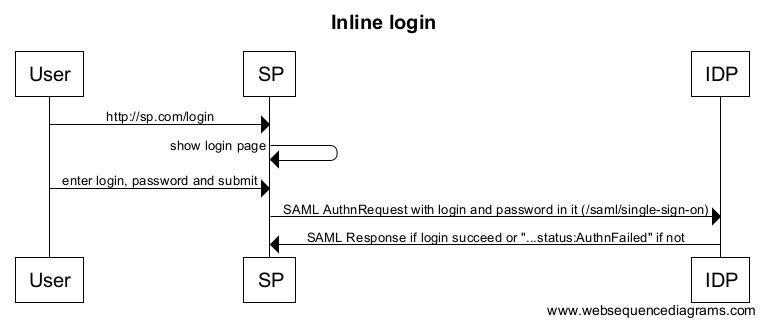 When the user submits the login form, the SAML SP sends an Authentication Request to the SAML IDP. This Authentication Request must contain the credentials that were submitted by the user. The password must be encrypted. If the credentials are correct, the SAML IDP creates a session and proceeds with the login. If the credentials are incorrect, the SAML IDP must not present a login page, but returns a SAML response with feedback that authentication failed.